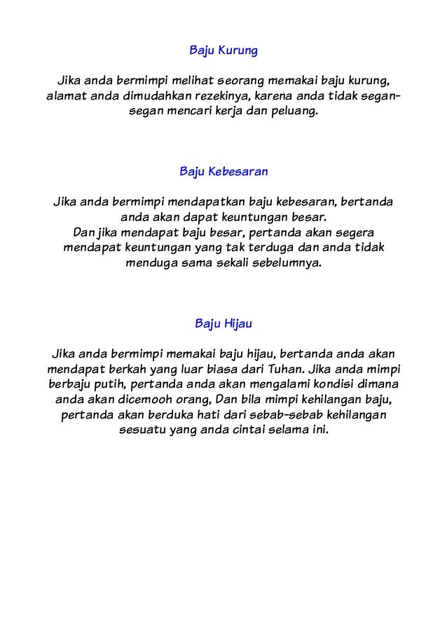Awas Jangan Suka Bertanya Arti Mimpi Jika Salah Akan Berbahaya Youtube from i.ytimg.com Arti mimpi melihat pakaian beraneka warna. Kebaikan yang selama ini anda lakukan akan membuahkan hasil atau anda sedang diingatkan agar berlakulah lebih arif dan bijak tuhan melihat anda. Jika anda adalah seorang muslim, disarankan untuk selalu membaca doa setelah terbangun dari mimpi. Arti mimpi melihat orang lain memakai baju putih. Mimpi melihat pakaian bernoda darah maka sebaiknya kalian harus beristirahat serta minum air putih untuk memulihkan kondisi kalian. Nah, mimpi ini konon ialah sebuah perumpamaan perihal hidup seseorang, yaitu jikalau ada seseorang yang tengah mengalami mimpi melihat orang berbaju serba biru itu menunjukan bahwa orang tersebut dalam waktu yang tidak. Akan dicurigai orang, padahal tidak salah. Akan berjodoh dengan perempuan budiman serta hartawan.